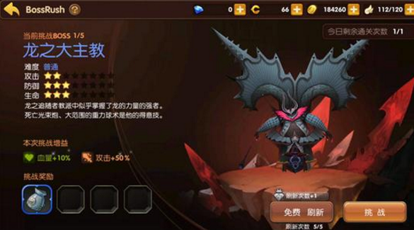 1、BOSSRUSH分为独立的5小关,每一关根据怪物难度会有对应品质的挑战奖励。(每天有一次挑战机会,这些怪物品质是可以免费刷新两次然后后续刷新就要龙币了。品质越好的怪物当然奖励也就越高,但是也越难打。)