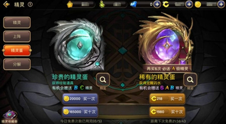 在这珍贵的精灵蛋中玩家有机会抽中B和C级的精灵,每次抽卡需要消耗20000金币,而如果是选择十连抽的话只需要165000金币。相对于平民玩家来说这B和C级精灵可以用于前期过度,不过在后期的话B和C级的精灵就不够看了。不过玩家每天拥有五次免费抽卡机会,所以玩家可以利用这免费机会去抽卡,而金币的话还是留着去培养精灵会比较好一些。