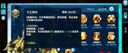 技能加点:等级加满。少侠们众所周知,天王最主要的作用是团战输出和承受伤害,在30级之前作为天王团战时的主要输出技能一定要点满。