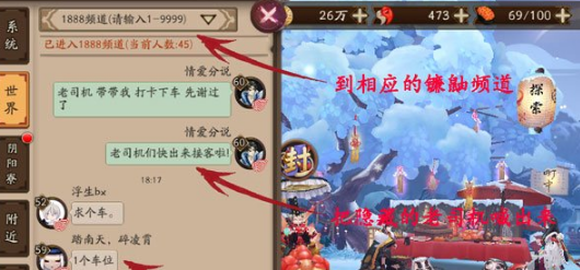 这里给大家实际去刷一趟镰鼬来给大家演示一下怎么去刷,跳转到镰鼬频道,这里是1888,然后就可以在世界里喊老司机出来载客了,发现司机立刻加他好友。