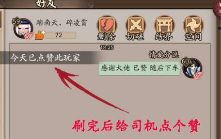 刷完之后记得给司机道谢并且点赞,这样才会有人持续的来开车,不然一点回报都没有谁会来给你刷碎片。删好友是因为好友有上限,删掉方便司机们搭载新的乘客,让更多的人刷到镰鼬/桃花碎片,收集更多的赞。有想要别人给自己点赞的小伙伴们可以用挑战券刷出副本后去频道开车,一个小时只要乘客多还是能赚到不少赞的。