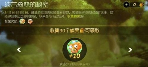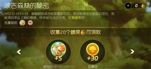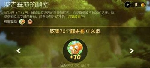 活动介绍:活动期间内,神秘种族波吉松鼠重新现世。传说取得波吉松鼠的信任,就能得到幸运之神的眷顾。快来参与活动任务,收集榛果吧!