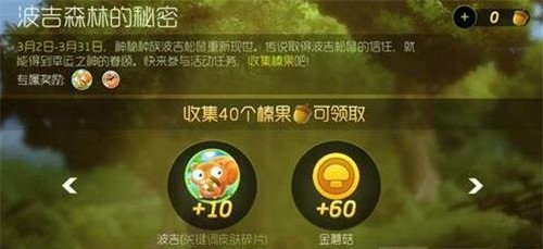 收集40个榛果,可领取10个波吉(关键词皮肤碎片),60个金蘑菇