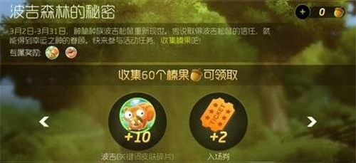 收集60个榛果,可领取10个波吉(关键词皮肤碎片),2张生存入场卷
