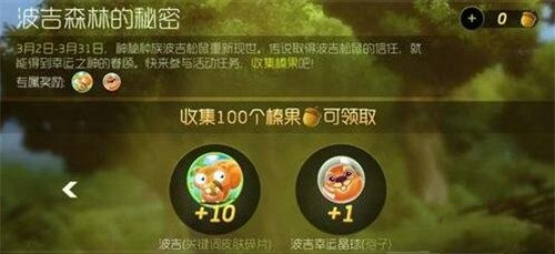 收集100个榛果,可领取10个波吉(关键词皮肤碎片),1个波吉幸运晶球(孢子)