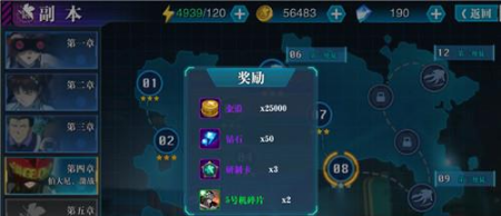 玩家在通关每章剧情副本时,一定不要忘了领取额外的宝箱奖励,宝箱奖励会根据玩家在本章副本中获得的星数决定,所有关卡都得到三星可以领取三个宝箱奖励。奖励包括金币、钻石、研制卡和机甲碎片。