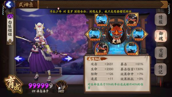 白狼是一个典型的破势系式神,并且是强力的破势爆伤系式神。所以在御魂选择上,我们主要的思路是在能够堆满暴击基础上考虑爆伤。那么,就有接下来的御魂选择。
