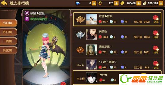 魅力排行榜的排行依据是玩家的魅力值,魅力值越高,排名越靠前。魅力值可以通过别人送花的方式来提高,不同的送花方式可以提升不同的魅力值,怎么感觉是给土豪追妹子用的呢。最后,在榜单的前10名,可以获得魅力专属称号。