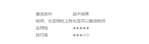 战术介绍:女巫和牧师是一个比较常用的组合,这个战术的特点在于技能没有冷却时间,只要女巫存活轮到女巫行动就可以复活牧师,再配合女巫自身的控制技能,可以起到逆转战果的作用。