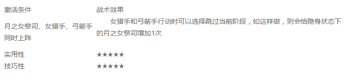 战术介绍:弓箭手和女猎手进入战斗的时候都是隐身状态,在对方没有反隐技能的情况下可以很好的保存自己,但也因此造成伤害不足。这个战术很好的弥补了这一缺点,通过牺牲弓箭手和女猎手的进攻机会来增加月女的攻击次数,配合月女的灼热之箭,可以对敌方单一单位造成大量的伤害。