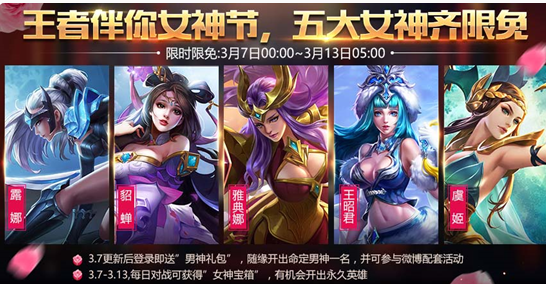 活动期间参与5V5对战,排位,娱乐模式,赏金赛可以获得女神礼包,有机会开出永久英雄