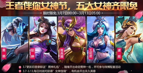 活动期间参与5V5对战,排位,娱乐模式,赏金赛可以获得女神礼包,有机会开出永久英雄