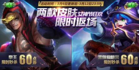 召唤师们好!3月7日就是女神节啦,不晓得荣耀峡谷里的女神和男神要如何度过呢((*^__^*))!为了和大家一起庆祝,小妲己特地央求了好久,争取到了2款非卖皮肤的限时返场秒杀,快来抢购吧~