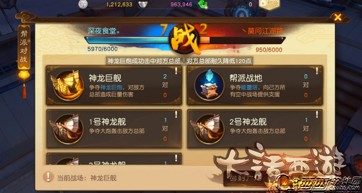 1、帮战中战场分为帮派战地、神龙巨舰、神龙舰三种,每个战场能够容纳每帮派3人对战;
