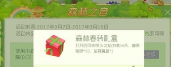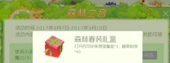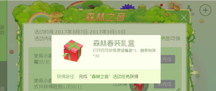使用小森林音乐会(光环)参与生存模式并获得胜利1次,可得森林春装礼盒一份,打开后可获得3个愿望魔盒,糖果炮弹40个;
