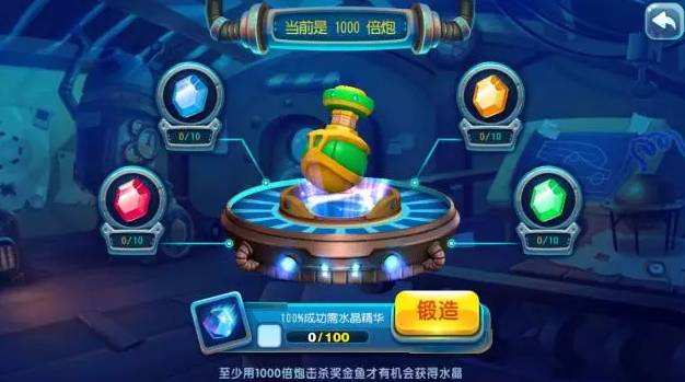 解锁1000倍炮台后,就可以正式进入锻造系统咯。每次锻造炮台都需要消耗蓝水晶、黄水晶、红水晶、绿水晶各10个,而这4种水晶可以通过使用大于等于1000倍炮击杀金鱼来获得。