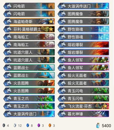 南海船工:11圣盾兵更能战场,但哈哈后期也是伤害的神抽,并且外挂帕奇斯。海盗和鱼人体系的双重滤牌为后期神抽熔岩爆裂呼脸提供了更大的可能。