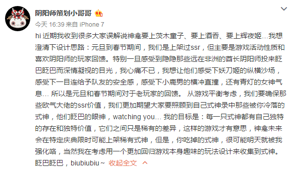hi 近期我收到很多大家误解说神龛要上茨木童子、要上酒吞、要上辉夜姬…我想澄清下设计思路:元旦到春节期间,我们是上架过ssr,但主要是游戏活动性质和喜欢阴阳师的玩家回馈。