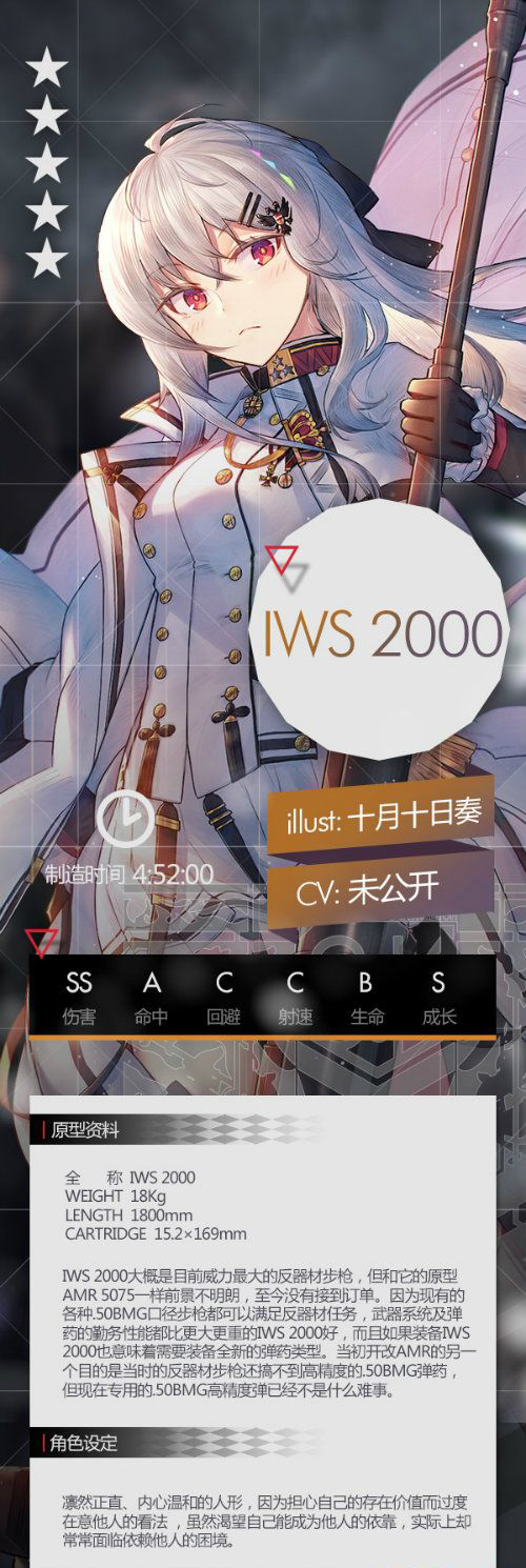 指挥官们,今天为大家带来的是五星步枪人形IWS 2000的介绍!她的原型作为目前威力最大的反器材步枪之一,因为种种原因,前景尚不明朗,但是在《少女前线》中,她将发挥出优秀的实力。本周四维护后,IWS 2000将与希普卡、AEK-999一同加入建造!在普通人形建造与重型建造中均会出现!
