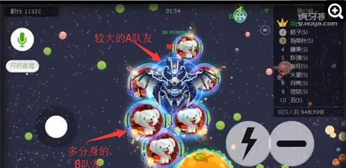 2:A玩家有很多分身,而B队友的分数很多,可以吃掉A玩家的分身,就需要不断的吃掉A的分身;