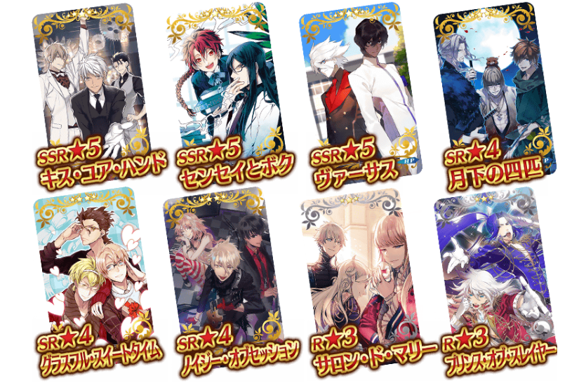 「★5(SSR)Kiss your hand」「★5(SSR)老师和我」「★5(SSR)VERSUS」「★4(SR)月下的四位」「★4(SR)Graceful sweet time」「★4(SR)Noisy obsession」「★3(R)玛丽沙龙」「★3(R)SLAYER之王子殿下」也将作为期间限定登场!