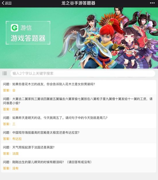 这里给大家推荐一个答题器,可以用关键词查询问题,至于下载方法,大家自取去找吧。也可以不下载APP直接在游信的微信上输出龙之谷答题,然后输出问题的关键词也能得到答案。