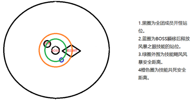 下一个技能就是风暴之眼,以这个点为中心(如图)散开站位,BOSS瞬移后开始释放技能大家迅速跑向BOSS开始疯狂输出,BOSS技能释放完后.