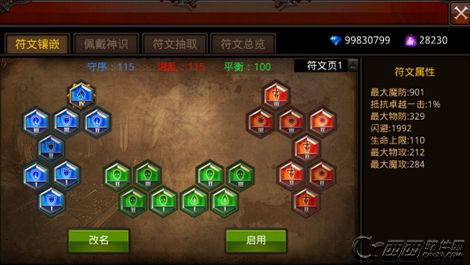 符文镶嵌界面,界面上总共24个符文槽,分为守序、混乱和平衡三类,每个种类镶嵌8个符文,每个符文会分别增加不同的属性和神识值,进入游戏默认只开启两个符文页,可以从界面右上角进行切换符文页,也就是可以选择不同的套路属性来搭配符文,使得能够收益最大,当然后续可购买多个符文页。