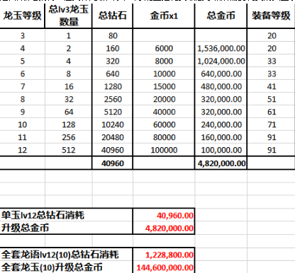 近日,贴吧就有一位大神无聊,统计出了龙玉强化到最高等级所需要耗费的资金表!一起来看下吧!
