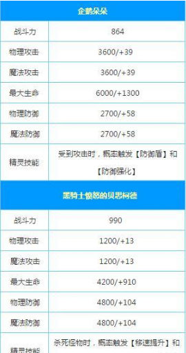 企鹅朵朵 战斗力 864物理攻击3600/+39 魔法攻击 3600/+39最大生命 6000/+1300物理防御 2700/+58 魔法防御 2700/+58精灵技能 受到攻击时,概率触发【防御盾】和【防御强化】