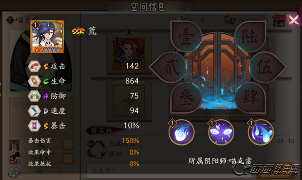 荒这个式神比较考验找机会的能力和对自己队伍的了解还有鬼火的把控,是一个很霸道的输出型式神尤其是2,3技能升满之后。速度D建议配合琴师找机会,阵容需要磨练。防御极高,生存能力强。御魂建议:1,针女,暴力输出。2,日女,魍魉半控半输出