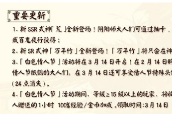 阴阳师2017要迎来白色情人节活动了,那白色情人节有什么活动,想必很多玩家并不是很了解,为此小编给大家带来了一则关于阴阳师2017白色情人节活动介绍,小编赶紧为各位玩家细细讲解一下,感兴趣的一起去看看,希望大家喜欢。