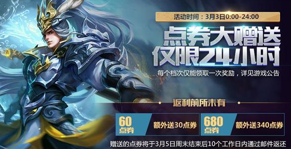 王者荣耀3月3日充值返利怎么只有30点券,王者荣耀3月3日开启了充值返利的活动,玩家进行充值可以获得多的点券,不过很多充值了的小伙伴反映只收到了30点券,3月3日充值返利是怎么发放的,西西小编来为大家介绍。