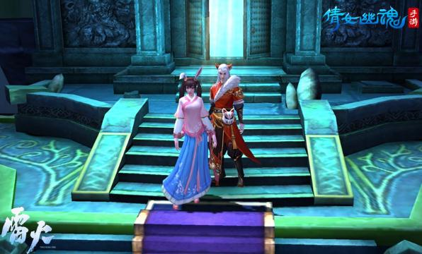 男款长袍下摆红的热烈,与纯白的上衣皮草衣襟组成了极具力量感的线条。腰间的妖狐面具与灵动狐耳让角色多了一丝神秘。