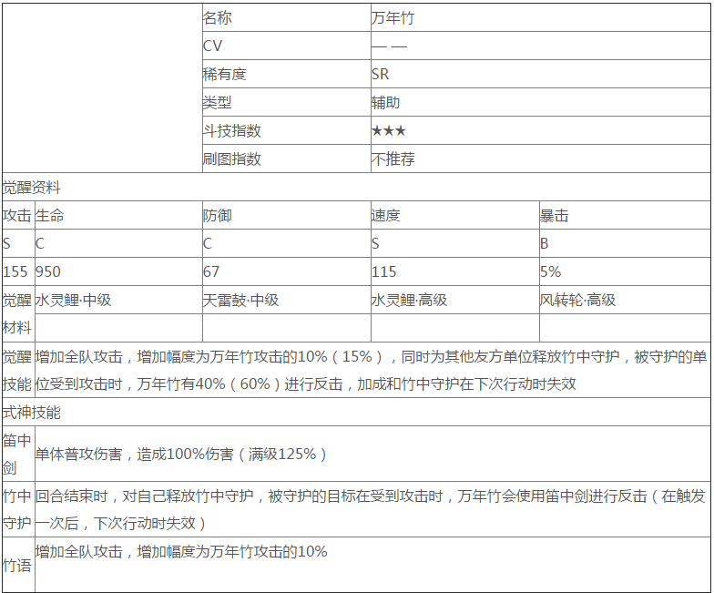 万年竹激励己方队友,使队友攻击力增加,增加的数值为万年竹的10%,同时为其他队友释放竹叶守护。被竹叶守护保护的单位有一定概率使用笛中剑反击。加成和竹叶守护效果在下次行动时结束。