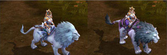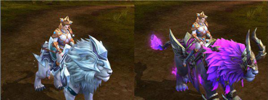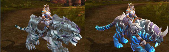 版本更新前的银翼战虎即是坐骑中的高人气成员,合体的银色盔甲使它显得英武非凡,但给人的印象却仍是以“防御”为主。而在更新后的版本中,战虎的盔甲不仅多了雕刻细节,造型立体感更加强烈,头顶尖角的设计也显得杀气十足,更具攻击性。此外,光效与虎身纹路的搭配不仅在百兽之王的霸气成功融合了风雷质感的魔幻效果,更使得 “战意”汹涌而出,完美契合了“战虎”的名号。