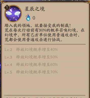 每次行动前有30%的概率召唤幻境,在幻境中,所有己方单位使用普通攻击时,荒都会使用普攻进行协助作战。