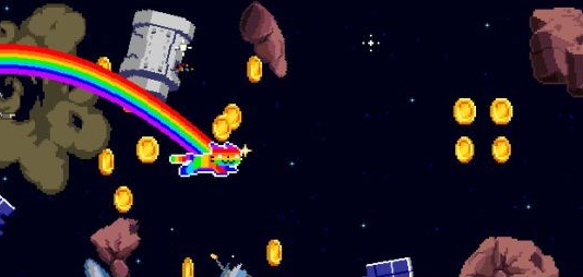 当然,作者在游戏中还是搞了很多有趣的地方,比如遇到狗,人,或者很多搞怪的物品,都会有特殊的效果,还是比较用心的,当然最让我喜欢的是,里面有个物品,吃了以后就可以用彩虹猫的形式,在金币的宇宙中穿梭,有点马里奥用树藤上天吃金币的味道。除此之外,还有一个个小段冲刺的道具,都让游戏有点炫酷的色彩。