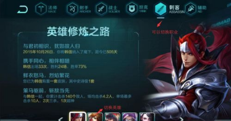 点击上方的职业按钮可以切换不同职业,点击下方的英雄按钮可以查看该职业中已拥有英雄的历史记录哦。 该面板还为大家提供了换肤功能,单击左侧的人物图像,会出现【更换形象】按钮,点击后出现该英雄的皮肤列表,召唤师们可以选择一套自己已经拥有的皮肤,咻~一键换装完成!赶快分享给小伙伴们一起炫耀一下吧!