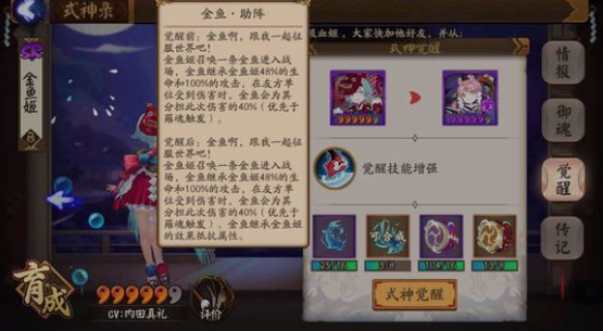 阴阳师金鱼姬觉醒后属性怎么样,金鱼姬觉醒属性面板一览,阴阳师金鱼姬属性技能曝光,金鱼姬觉醒前属性为CSCAB,金鱼姬觉醒后属性为BSBSB,作为辅助式神,金鱼姬尤其是速度和生命是S属性,还是非常不错的,那么阴阳师金鱼姬觉醒后属性怎么样,下面带来金鱼姬觉醒属性面板一览。