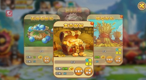 在祭坛系统中,分为金币祭祀,粮草祭祀、及天命石祭祀,每种祭祀可获得对应的资源,在玩家资源不足时,可通过祭祀获得额外资源。