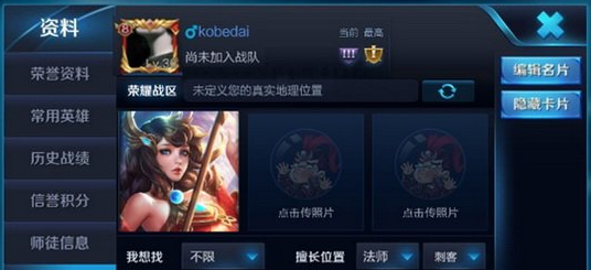 15级以上的召唤师,可以在资料=》交友名片页面中,上传自己的照片。
