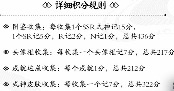 图鉴收集可以获得436分,皮肤收集有322分,成就收集212分,头像框收集217分
