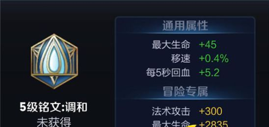 蓝色铭文:调和,最大生命+45、每5秒回血+5.2、移速+0.4%