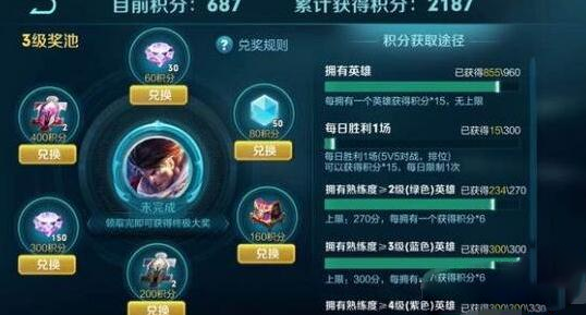 3. 每拥有一个熟练度≥3级(蓝色)的英雄,获得积分*10,上限为300分