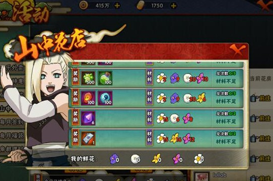 雏菊2、牵牛花9、香雪兰16、紫丁香10=声望500、忍玉100,可兑换5次