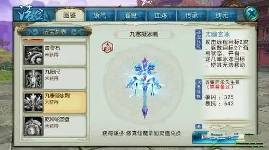 九寒凝冰刺可通过修真仙魔录获取,玩家需要使用仙灵值兑换,才能获得。 仙灵值则是通过通关修真仙魔录才能获得。