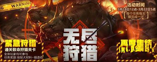 无尽狩猎为限时开放副本,将于3月22日5点关闭。