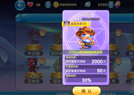 牛仔喵的登场效果:消灭星星方块加2000分;