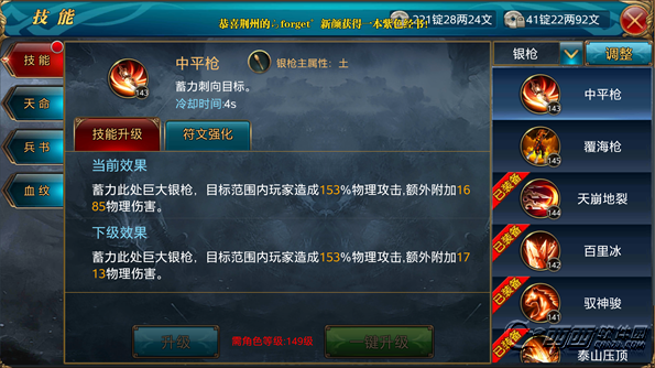 1.中平枪:蓄力刺出巨大银枪,对目标范围内玩家造成153%物理攻击,并附带额外的物理伤害;